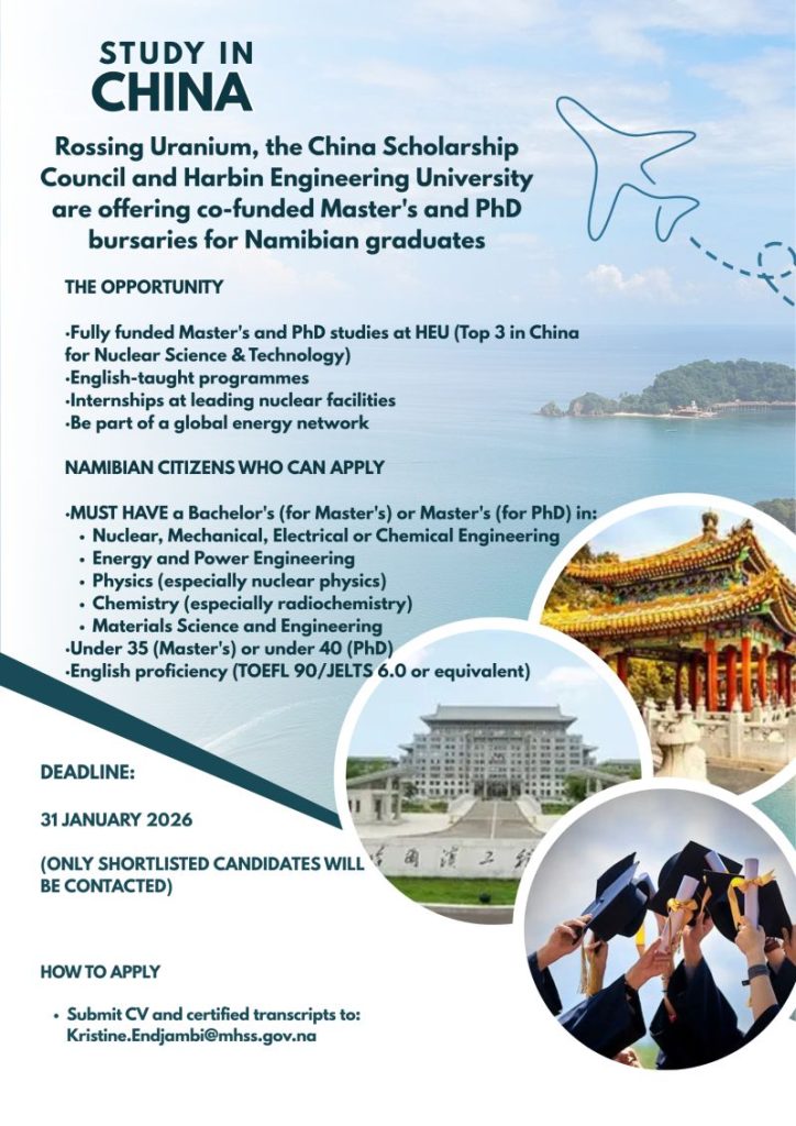 Rossing Uranium, the China Scholarship Council and Harbin Engineering University are offering co-funded Master’s and PhD bursaries for interested Namibian graduates.
