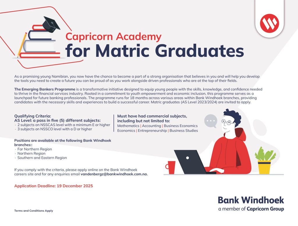 Bank Windhoek invites promising young Namibian matric graduates who meet the qualifications to apply for its Emerging Bankers Programme.