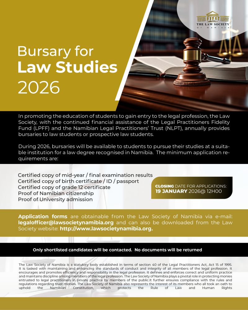 The Law Society of Namibia invites Namibian students who are interested in pursuing their studies at a suitable institution offering a law degree recognised in Namibia.